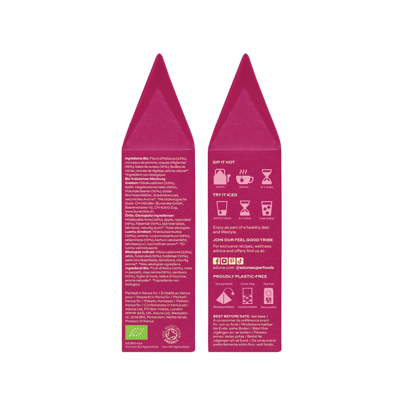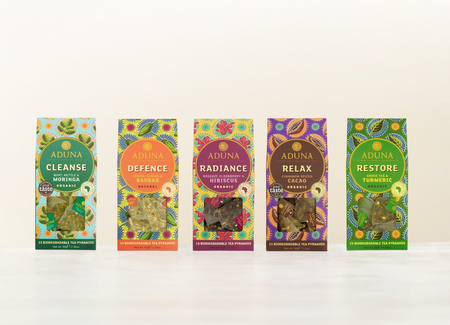 Packaging Box and label designs for Aduna Super Teas, each of which are specially crafted using the highest quality active botanical ingredients, giving each tea a unique feel good benefit.
