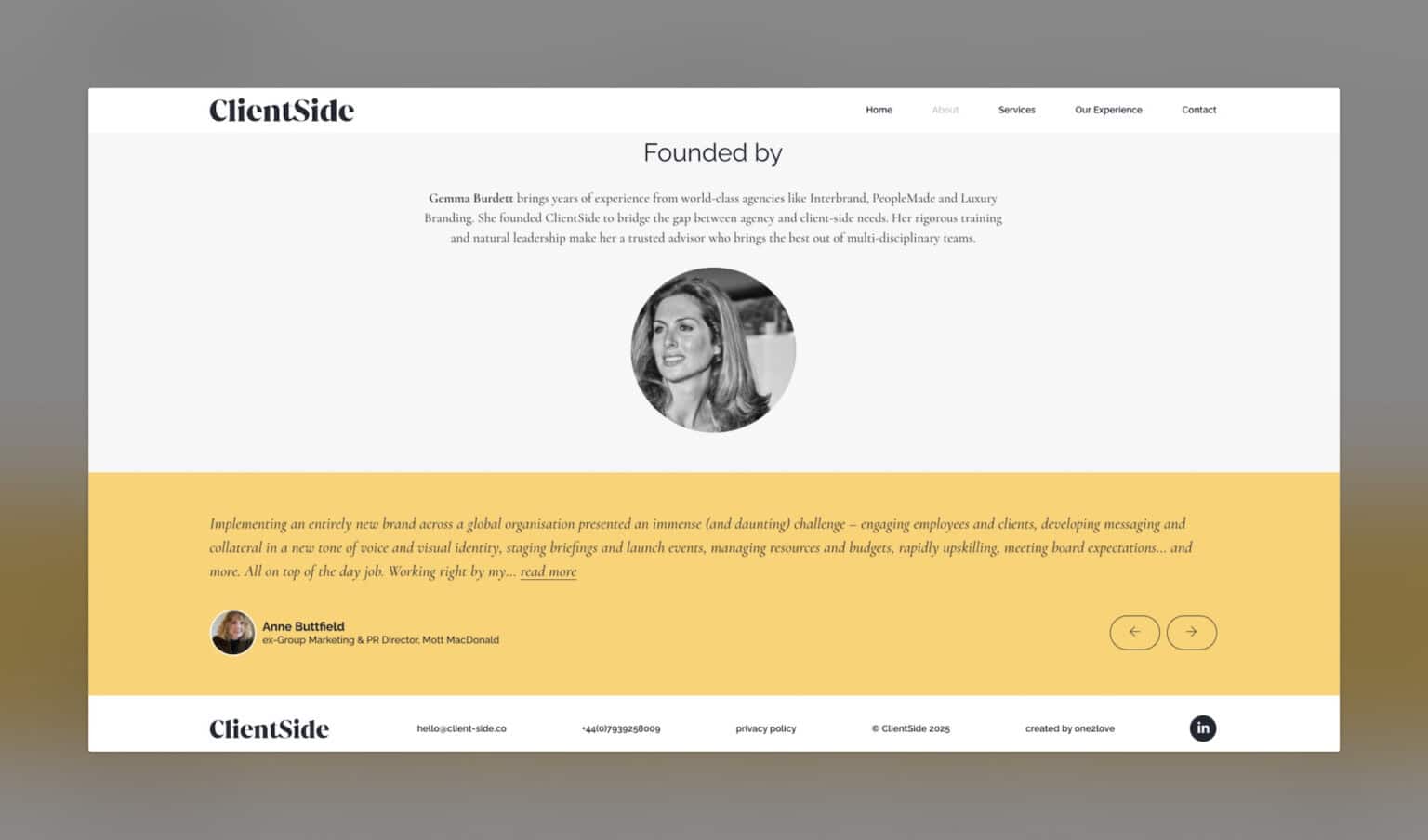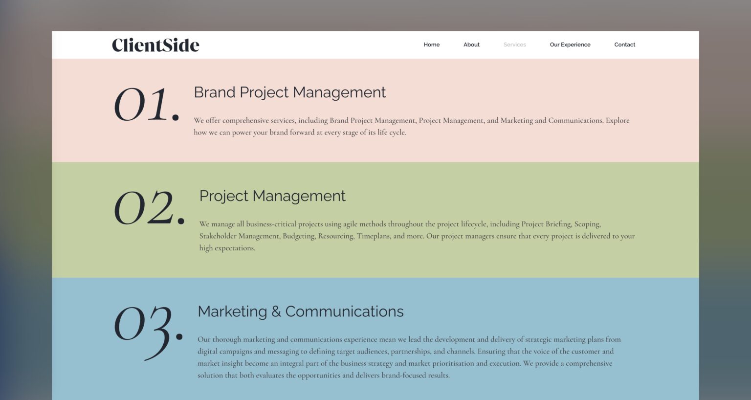 ClientSide empowers businesses through strategic project management and long-term client-side support. We developed their digital presence with a dynamic WordPress website that showcases their expertise in brand management, project delivery, and marketing communications. Built with Bricks, the platform features a flexible content management system that allows their team to continuously update their growing portfolio of successful projects and client testimonials, reflecting their commitment to delivering measurable business impact.