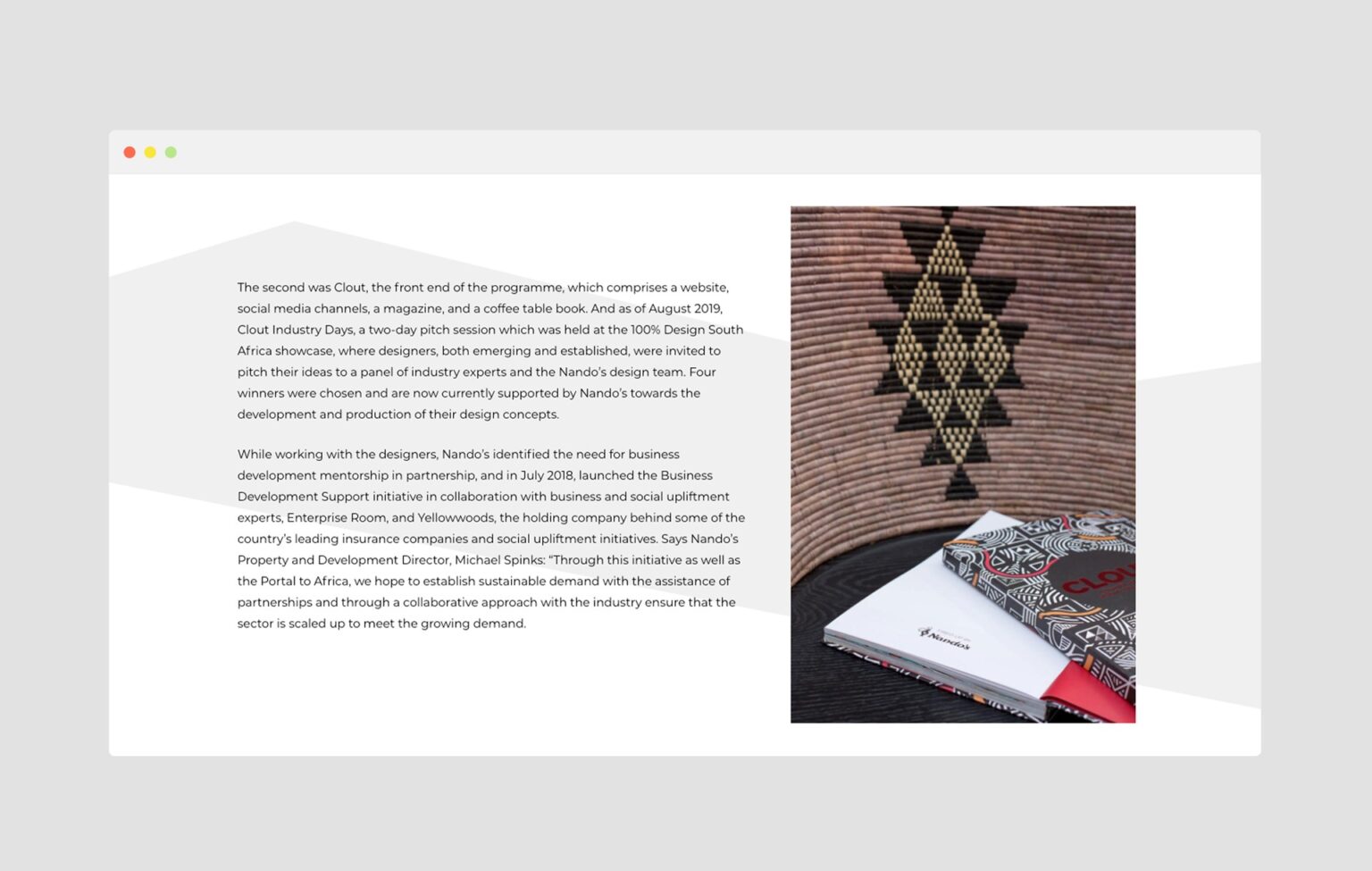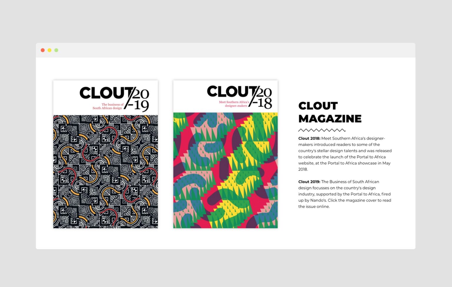 Clout is the vibrant showcase of the Nando’s “Portal to Africa” programme. Clout comprises of a website, social media channels, a magazine and coffee table book.