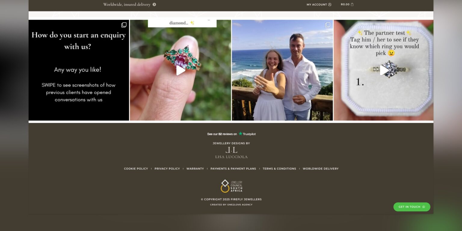 From their boutique in Plettenberg Bay, Firefly Jewellers creates bespoke pieces that showcase nature’s most beautiful materials. We developed their global online presence through a sophisticated WordPress and WooCommerce platform that mirrors the artistry of their custom designs. The multi-currency e-commerce site allows jewelry enthusiasts worldwide to explore their stunning collections, from platinum and gold pieces to unique gemstone creations. Built with Elementor, the content management system empowers their team to showcase new pieces as they emerge from their workshop, bringing their family-owned craftsmanship to a global audience.