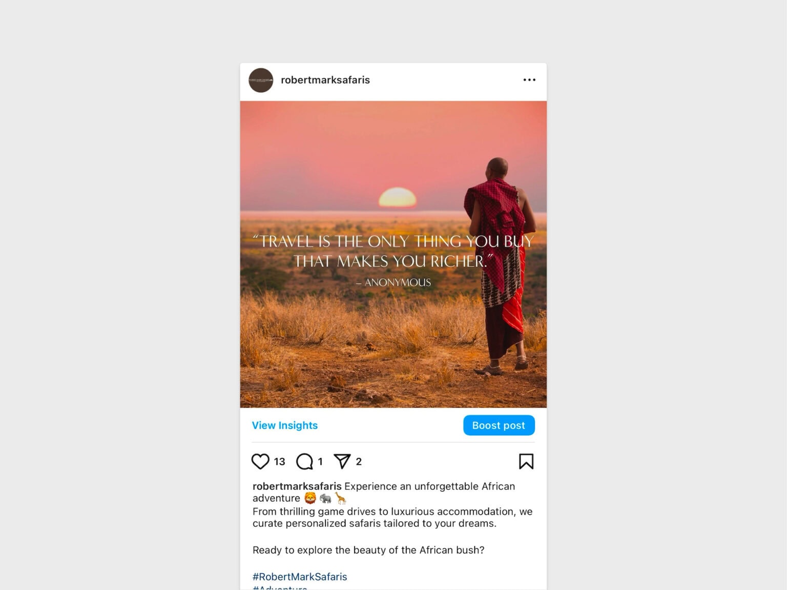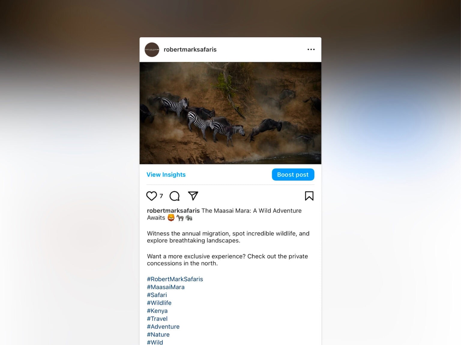 Robert Mark Safaris crafts extraordinary luxury travel experiences that stay with their guests forever. As their social media partners, we bring these remarkable journeys to life through carefully curated content on their social platforms. Our team captures the essence of their bespoke safaris—whether it’s a pride of lions lounging in the Serengeti sun, a luxurius island getaway in the Seychelles or an intimate moment with mountain gorillas in Rwanda. Through strategic storytelling and engaging visuals, we help Robert Mark Safaris inspire wanderlust and showcase their expertise in creating once-in-a-lifetime adventures.