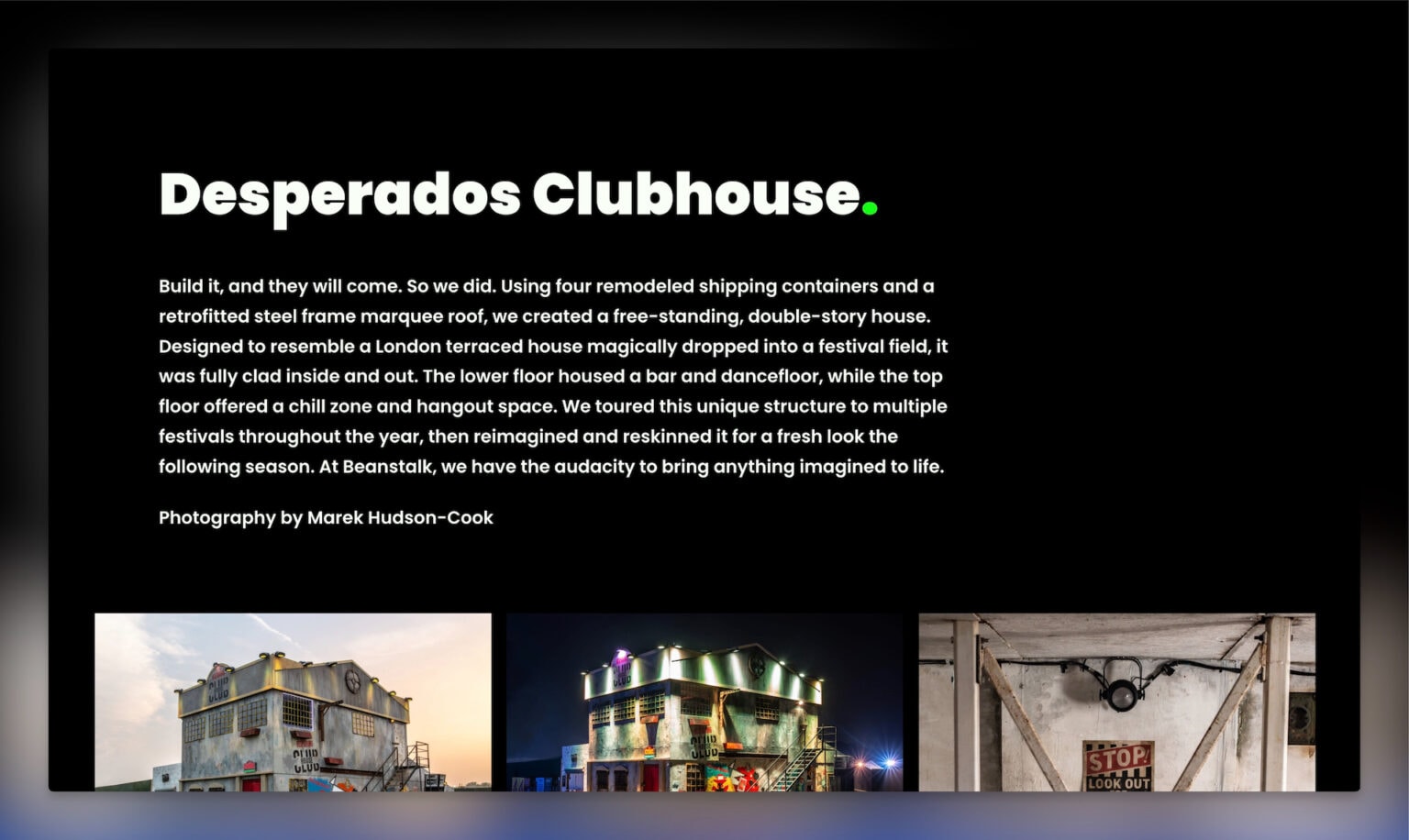 The Beanstalk has been crafting legendary events and unforgettable brand experiences for over 14 years. Our journey with them began with creating a custom WordPress platform featuring an event management system that showcases their creative excellence. In 2024, we elevated their digital presence through a technology upgrade, transitioning from Elementor to Bricks, while implementing their refreshed visual identity. The enhanced platform continues to empower their team to showcase their stunning portfolio of events, from intimate gatherings to large-scale productions.