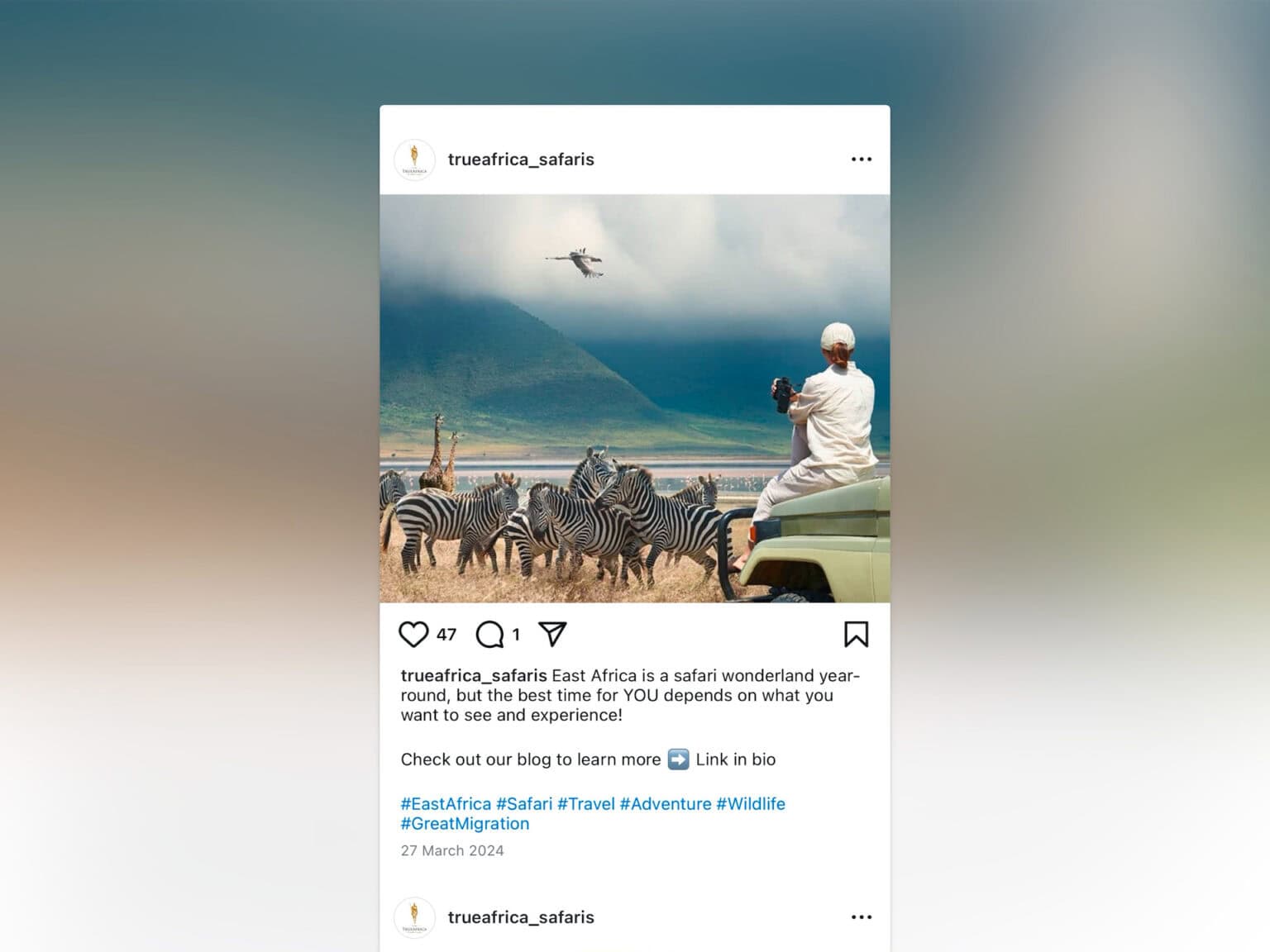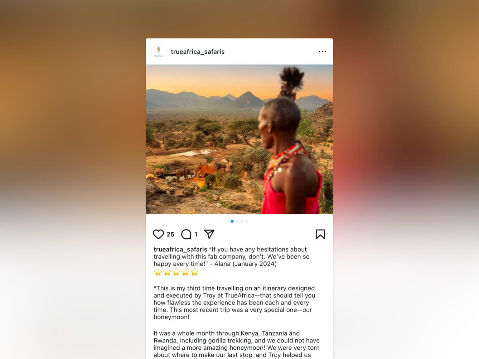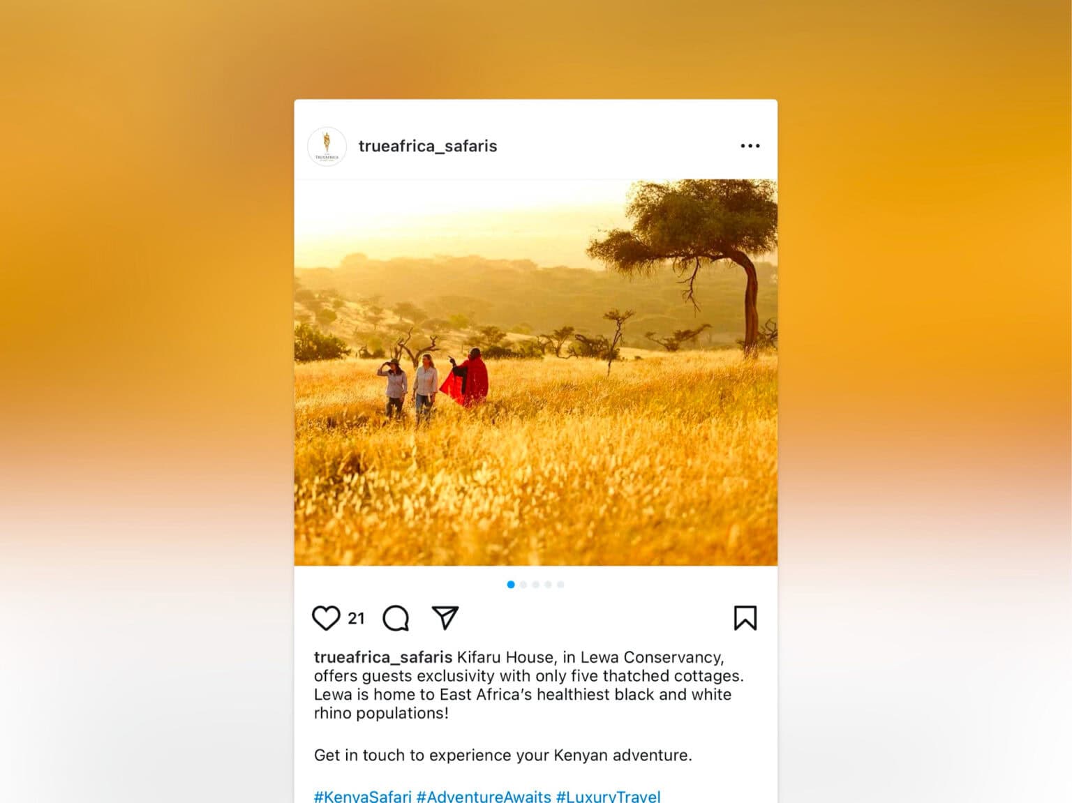 Since 2002, True Africa has been crafting authentic safari experiences that unveil the heart and soul of Africa. As their social media partners, we bring their remarkable journeys to life, sharing intimate wildlife encounters, breathtaking landscapes, and meaningful cultural connections that make their safaris truly unforgettable. Through strategic storytelling and captivating content, we help adventure seekers discover the magic of True Africa’s bespoke experiences.