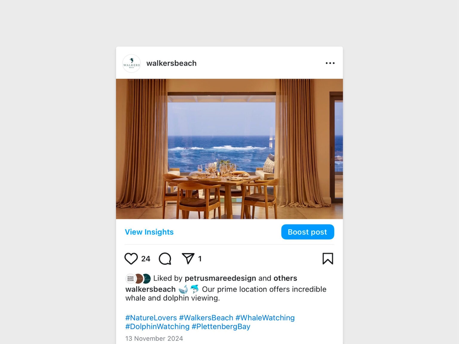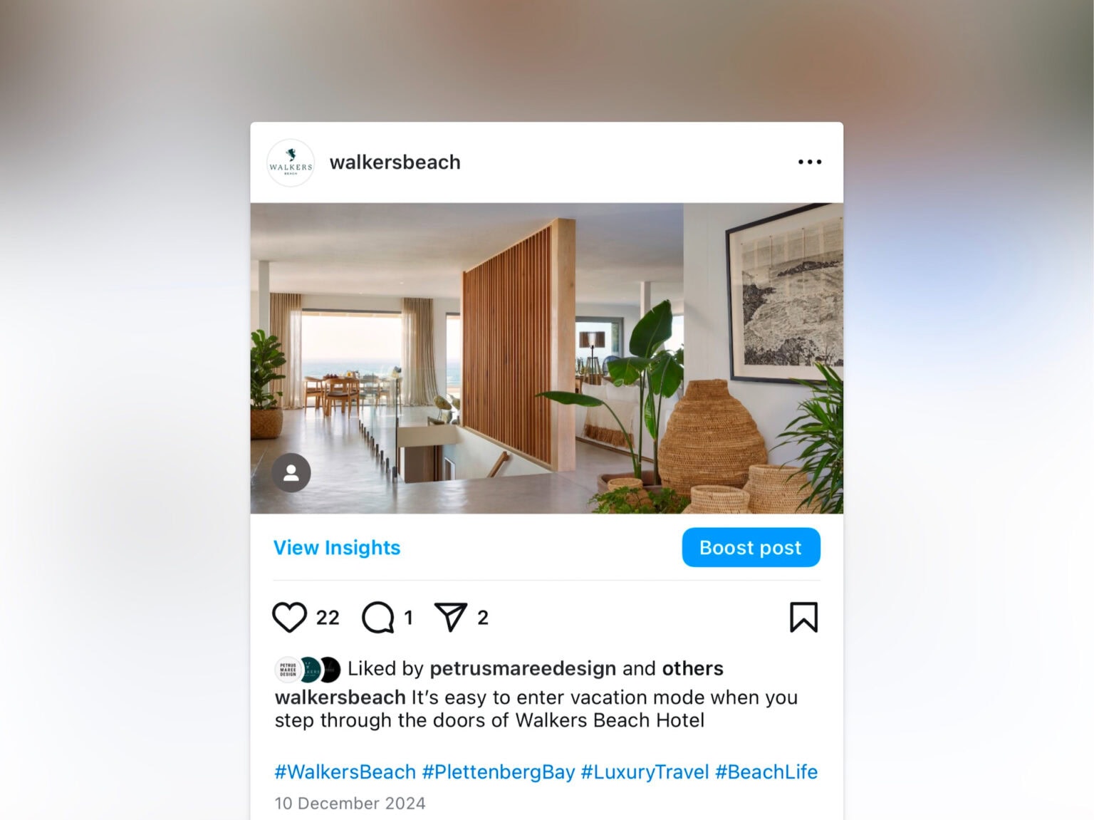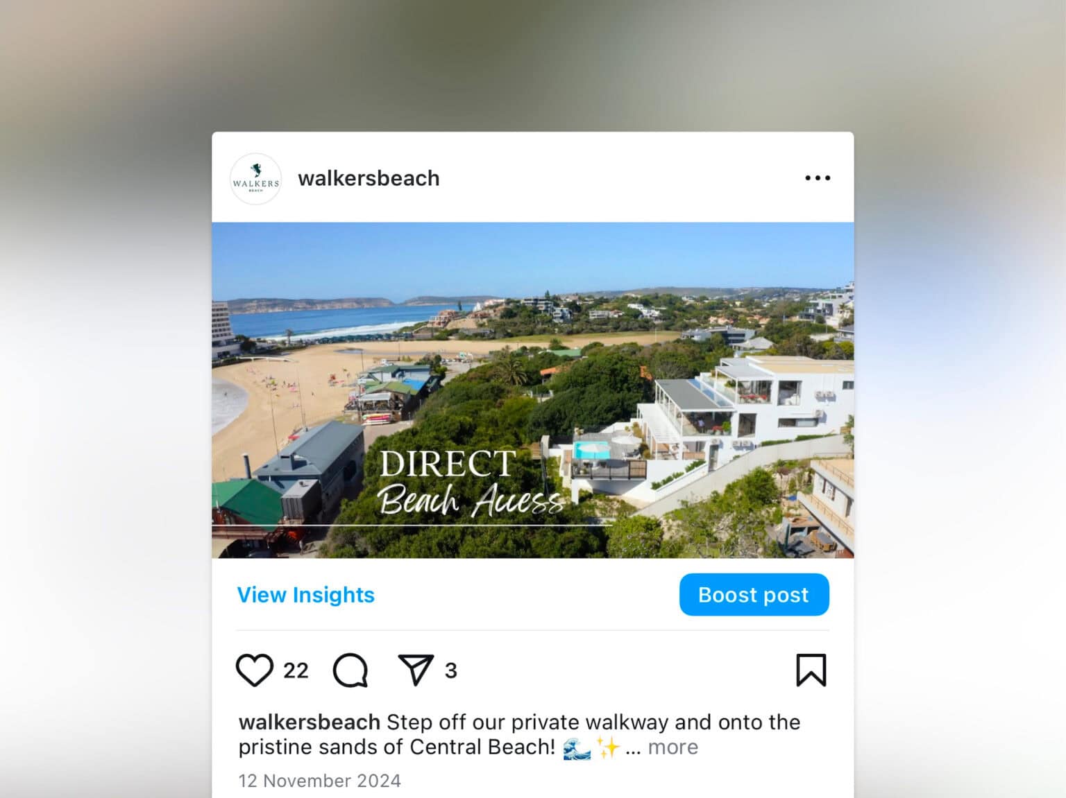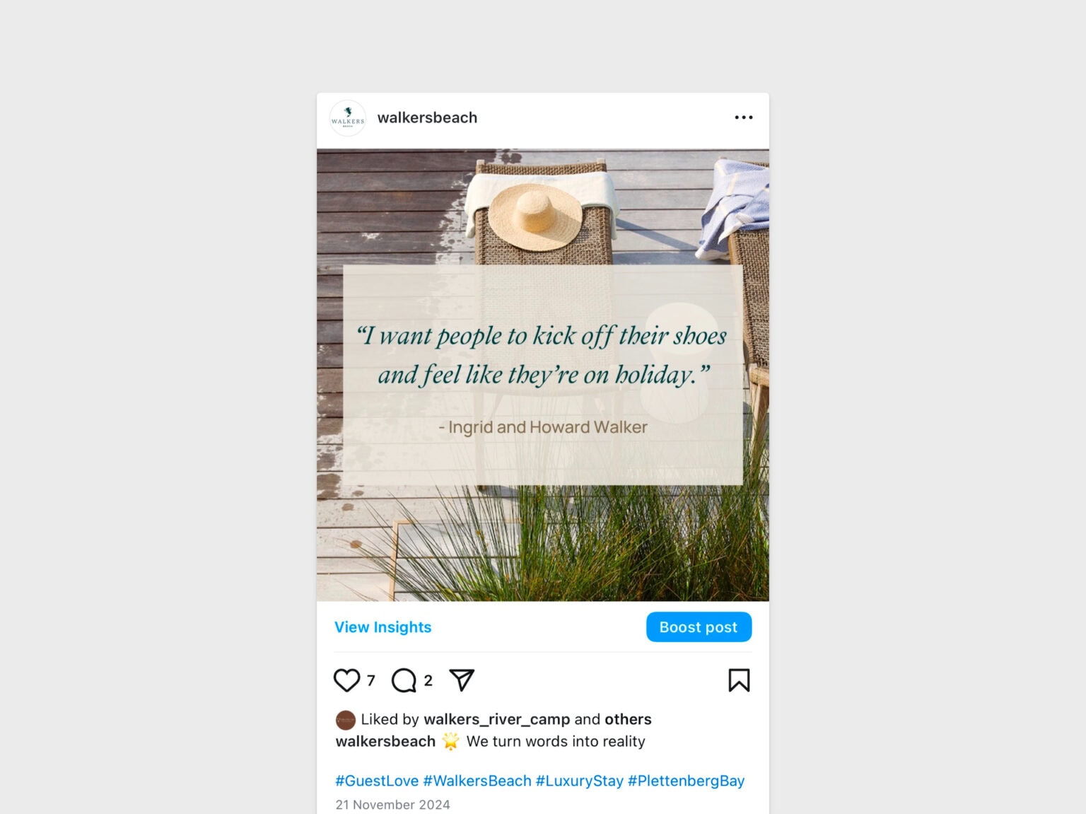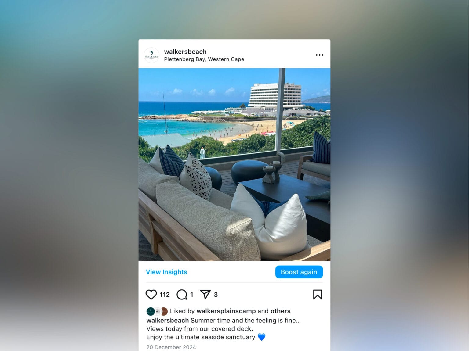 Nestled along the pristine shores of Plettenberg Bay, Walkers Beach offers an unforgettable coastal escape where luxury meets laid-back beach living. As their dedicated social media partners, we craft engaging content that captures the essence of this spectacular beachfront property—from dreamy ocean views and sophisticated accommodations to memorable dining experiences. Through strategic paid campaigns and carefully curated social content, we help travellers discover one of South Africa’s most beautiful coastal retreats on the Garden Route.